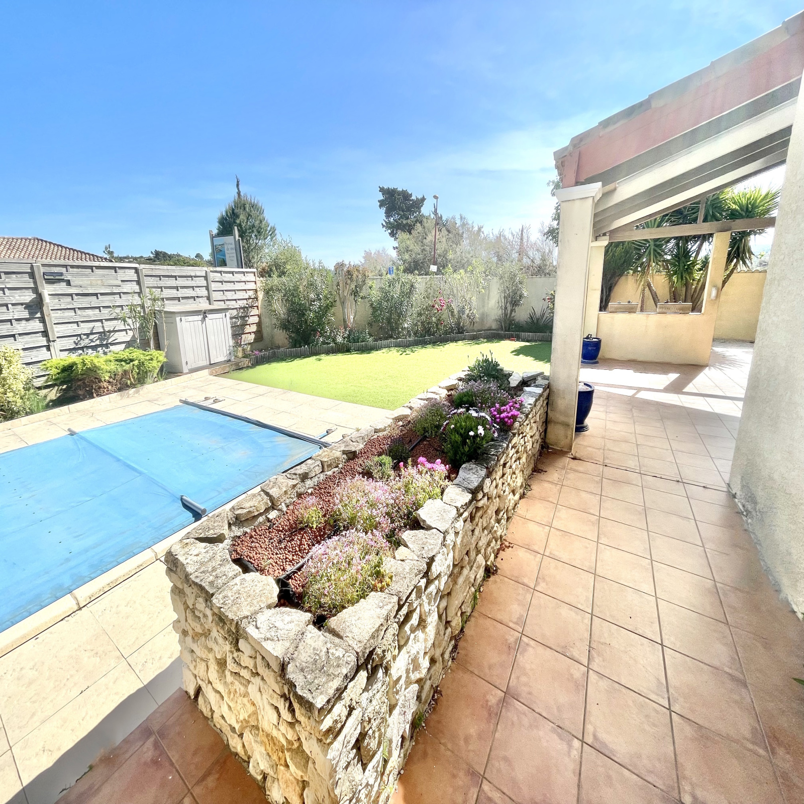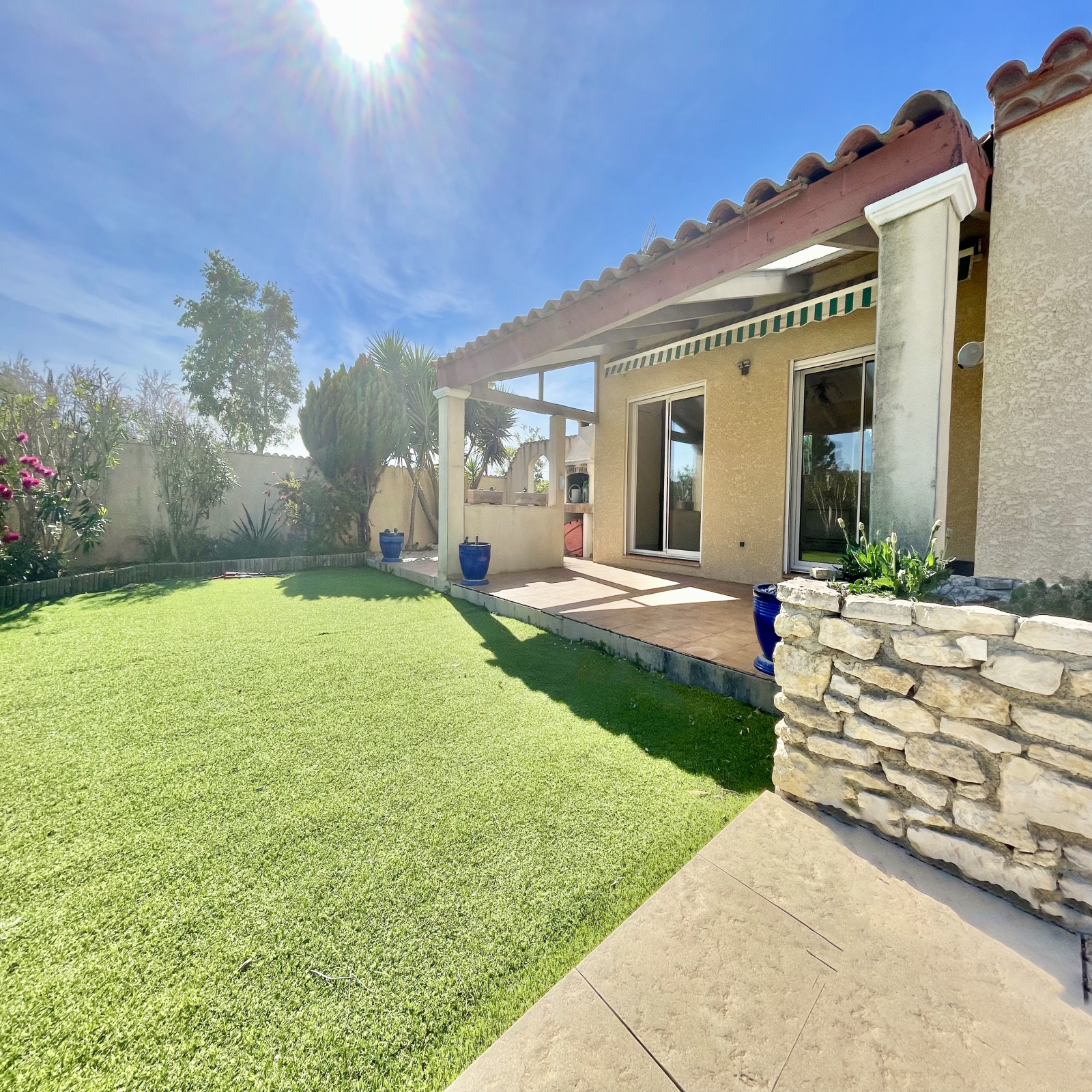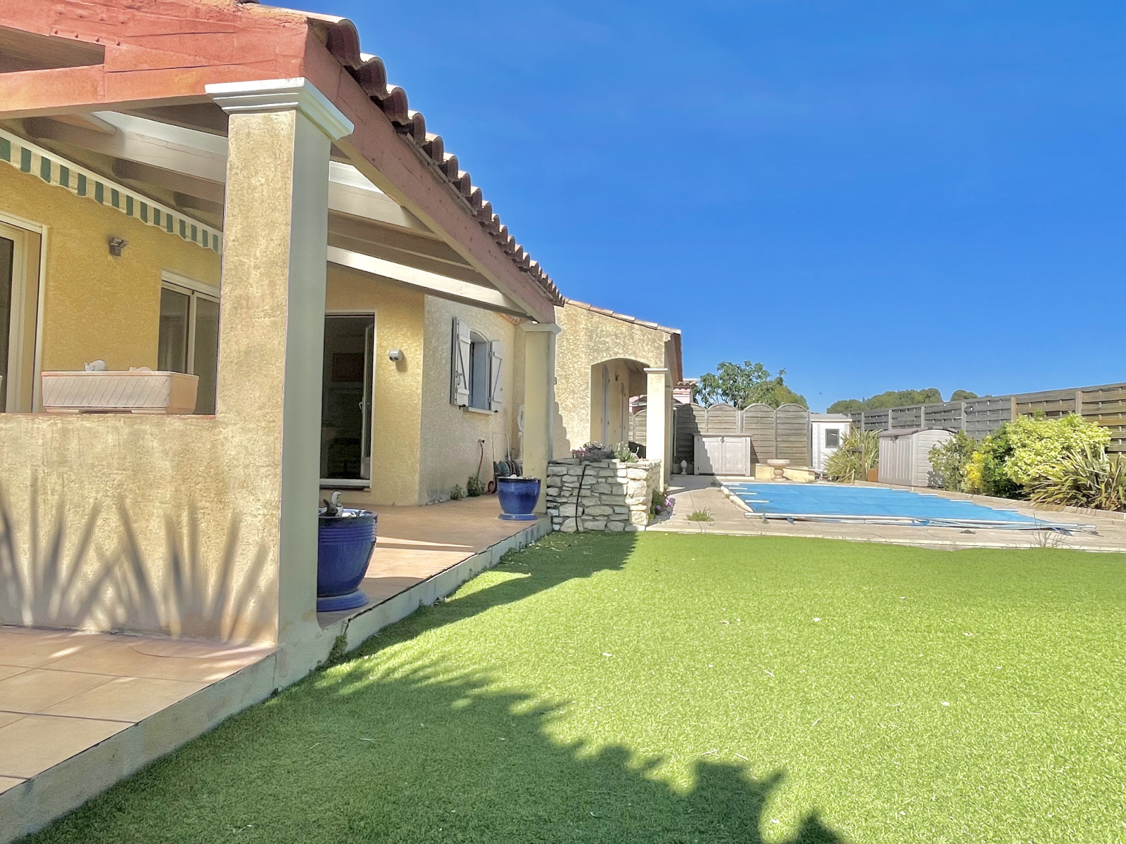 RARE - Situé dans la magnifique commune de Peyriac-de-Mer, proche du centre du village ( secteur pharmacie), à deux pas des étangs, VRS IMMOBILIER vous propose cette jolie villa de plain-pied d'une surface de 122 m2 implantée sur un beau terrain de 622 m2 avec piscine. Exposée plein sud et profitant d'un dégagement visuel sans vis-à-vis, la maison se compose d'un séjour de plus de 40 m2 ouvert sur le jardin et sa trés belle terrasse abritée du vent et des intempéries vous permettant ainsi de profiter de repas en famille ou entre amis quelque soit la météo. Une cuisine séparée de 11 m2 pouvant être ouverte sur le séjour profite également d'une porte fenêtre permettant l'accès à la terrasse. L'espace nuit offre trois belles chambres avec placard dont une agrémentée d'un salle d'eau privative avec wc. Une salle d'eau supplémentaire de 8 m2 avec WC, et enfin un wc indépendant. Un grand bureau/espace télétravail a également été aménagé vous permettant ainsi de vous isoler au calme. Idéal pour réaliser un atelier de création ou l'exercice d'une profession libérale/artisanale grâce à un accès extérieur indépendant par la vaste baie vitrée. Possibilité de garer plusieurs véhicules dans l'allée y compris camping-car, remorque nautique, etc... Menuiseries double-vitrage - Volets roulants motorisés avec commande centralisée - Alarme - Chauffage par pompe à chaleur ( climatisation ) - Arrosage goutte-à-goutte automatique - Filtration piscine au sel et traitement entièrement automatisé - Le plus : Un groupe électrogène de secours de dernière génération sous garantie de 3,2 Kilowatts avec son système de démarage déporté au tableau électriqe intérieur de la maison vous permettant d'envisager pour l'avenir l'alimenation énergétique de l'habitation sans tracas. terrain arborré et paysagé - Un bien RARE à VISITER RAPIDEMENT.